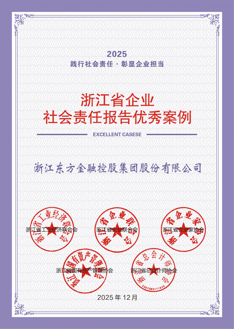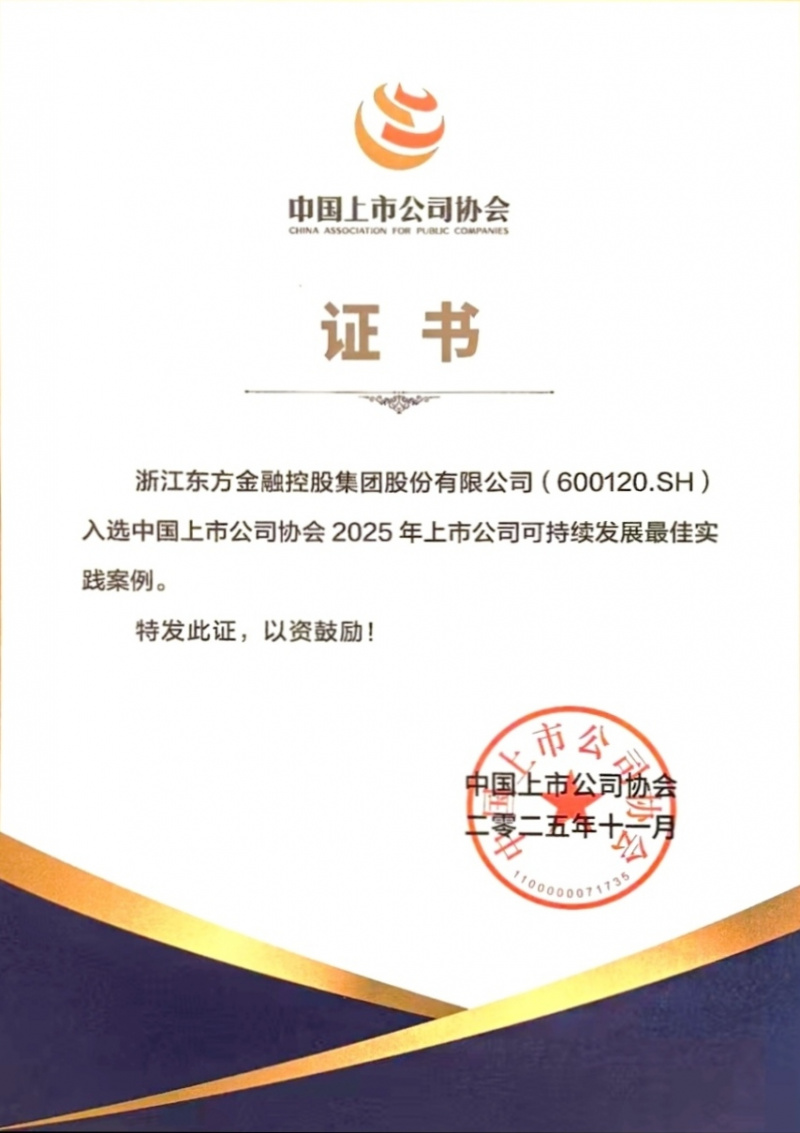 浙江东方再次荣获“2025年上市公司可持续发展最佳实践案例”“优秀上市公司奖”“最具社会责任上市公司奖”“2025浙江省企业社会责任报告优秀案例”等多项奖项。